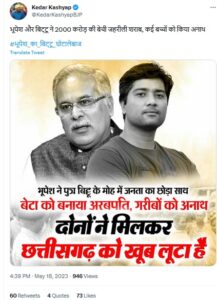 पिता-पुत्र के इस पोस्टर पर छत्तीसगढ़ को लूटने की बात भी दर्ज है. इस ट्वीट की हकीकत पता करने के लिए छत्तीसगढ़ के कुछ पत्रकारों से बातचीत की तो पता चला कि आयकर विभाग ने छत्तीसगढ़ में शीर्ष स्तर पर चलने वाले उगाही रैकेट का जो भंडाफोड़ किया है, उसकी चार्जशीट में सीएम भूपेश बघेल के पुत्र बिट्टू उर्फ चैतन्य बघेल तक पैसे पहुंचाए जाने का जिक्र है।