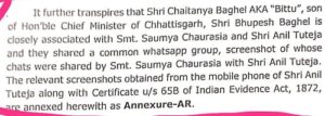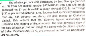 आईटी की चार्जशीट के उपरोक्त अंश से स्पष्ट है कि सीएम भूपेश बघेल की खास अफसर सौम्या चौरसिया अपने निजी सचिव जय को निर्देश देती हैं कि चैतन्य बघेल उर्फ बिट्टू को धन दे दें. पैसे देने के इस निर्देश से संबंधित ह्वाट्सअप चैट को आईटी ने सुबूत के बतौर पेश किया है।