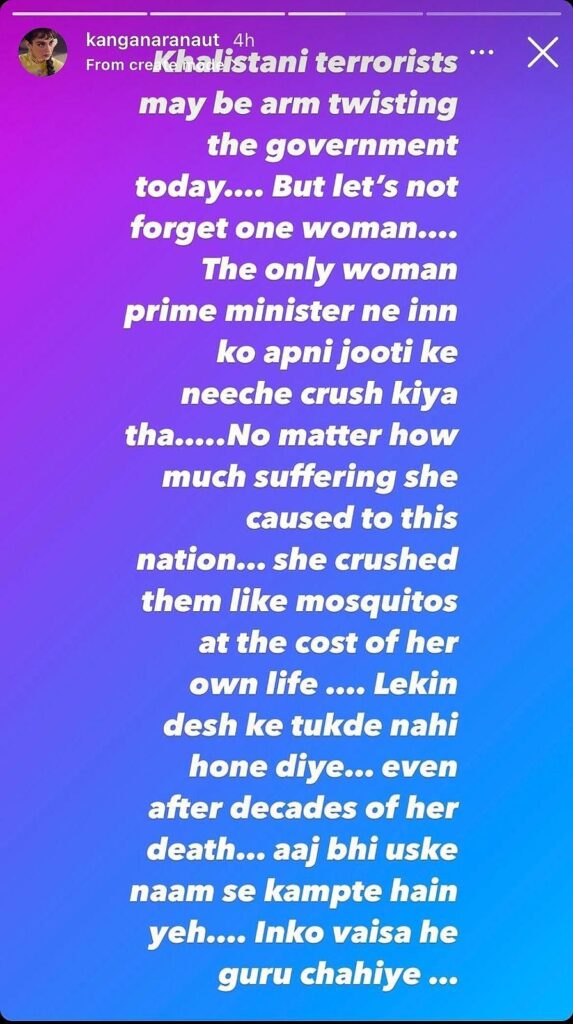 कंगना रनोट ने किसान आंदोलन के दौरान कई बयान दिए थे। उन्होंने सोशल मीडिया पर आंदोलनकारियों की तुलना खालिस्तानी आतंकियों से की थी। उन्होंने लिखा था- ‘खालिस्तानी आतंकवादी आज सरकार पर दबाव बना रहे हैं, लेकिन हमें एक महिला प्रधानमंत्री इंदिरा गांधी को नहीं भूलना चाहिए। इंदिरा गांधी ने इन्हें अपनी जूती के नीचे कुचल दिया था। भले उन्होंने इस देश को कितनी भी पीड़ा दी हो, लेकिन उन्होंने अपनी जान की कीमत पर इन्हें मच्छरों की तरह कुचल दिया, लेकिन देश के टुकड़े नहीं होने दिए। उनकी मृत्यु के दशकों बाद भी आज भी उनके नाम से कांपते हैं, इनको वैसा ही गुरू चाहिए।’
