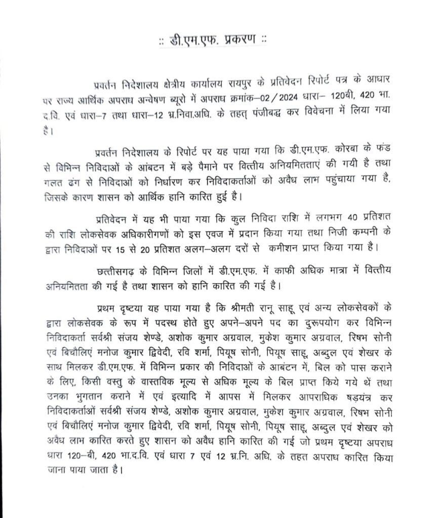 प्रथम दृष्टया यह पाया गया है कि रानू साहू और अन्य लोकसेवकों के द्वारा लोकसेवक के रूप में पदस्थ होते हुए अपने-अपने पद का दुरूपयोग कर विभिन्न निविदाकर्ता संजय शेण्डे, अशोक कुमार अग्रवाल, मुकेश कुमार अग्रवाल, रिषभ सोनी और बिचौलिएं मनोज कुमार द्विवेदी, रवि शर्मा, पियूष सोनी, पियूष साहू, अब्दुल और शेखर के साथ मिलकर डी.एम.एफ. में विभिन्न प्रकार की निविदाओं के आबंटन में, बिल को पास कराने के लिए, किसी वस्तु के वास्तविक मूल्य से अधिक मूल्य के बिल प्राप्त किये गये थे. साथ ही उनका भुगतान कराने में आपस में मिलकर आपराधिक षड़यंत्र कर निविदाकर्ताओं संजय शेण्डे, अशोक कुमार अग्रवाल, मुकेश कुमार अग्रवाल, रिषभ सोनी और बिचौलिए मनोज कुमार द्विवेदी, रवि शर्मा, पियूष सोनी, पियूष साहू, अब्दुल शेखर को अवैध लाभ कारित करते हुए शासन को अवैध हानि कारित की गई.