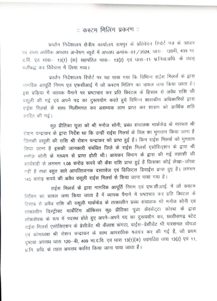राईस मिलर्स के द्वारा नागरिक आपूर्ति निगम और एफ.सी.आई. में जो कस्टम मिलिंग का चावल जमा किया जाता है, में व्यापक पैमाने में भ्रष्टाचार कर प्रति क्विंटल के हिसाब से अवैध राशि की वसूली मार्कफेड के तत्कालीन प्रबंध संचालक मनोज सोनी और तत्कालीन डिस्ट्रीक्ट मार्केटिंग ऑफिसर प्रीतिका पूजा केरकेट्टा कोरबा के द्वारा लोकसेवक के रूप में पदस्थ होते हुए अपने – अपने पद का दुरूपयोग कर, छत्तीसगढ़ स्टेट राईस मिलर्स एसोसिएशन के प्रेसीडेंट कैलाश रूंगटा, वाईस प्रेसीडेंट पारसमल चोपड़ा और कोषाध्यक्ष रोशन चन्द्राकर के साथ आपराधिक षडयंत्र कर की गई है।