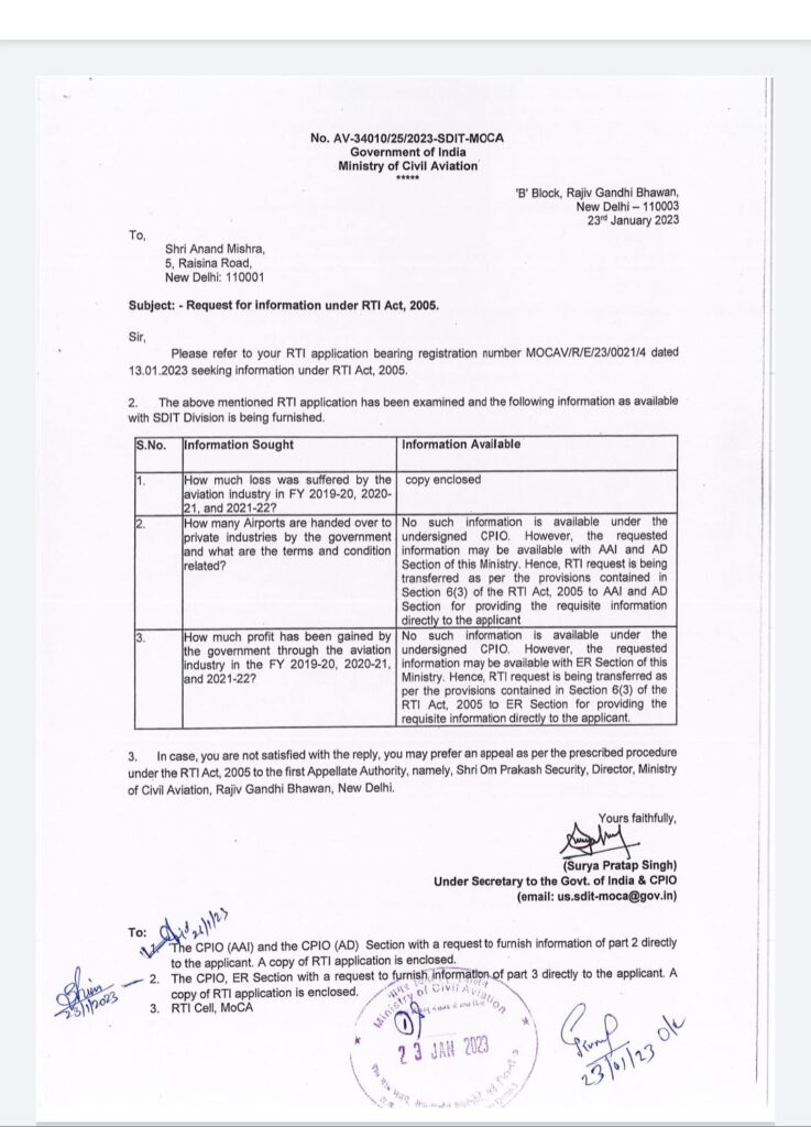 नई दिल्ली: भारतीय युवा कांग्रेस आईटीआई विभाग के राष्ट्रीय वाइस चेयरमैन आनंद मिश्रा ने नागर विमानन मंत्रालय में एक आरटीआई के जरिए जय जानकारी मांगी की नागर विमानन मंत्रालय को पिछले 3 वर्षों में कितने घाटे का सामना करना पड़ा है|