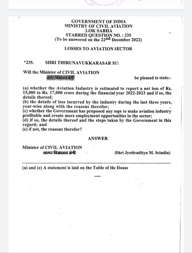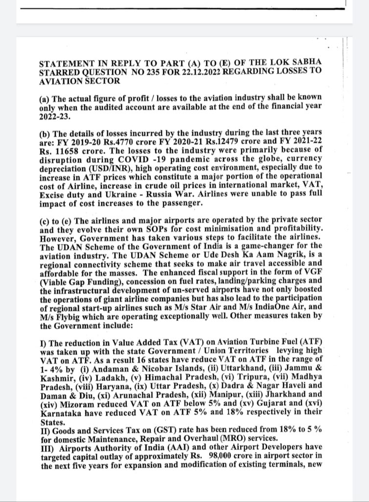 जिसके जवाब में नागर विमानन मंत्रालय ने यह जानकारी दी कि पिछले 3 वर्षों के दौरान विमानन उद्योग को काफी घाटे का सामना करना पड़ा है जिसमें वित्त वर्ष 2019-20 मैं 4770 करोड रुपए वित्त वर्ष 2020 21 में 12480 करोड रुपए और वित्त वर्ष 2021 22 मई 11658 करोड रुपए का नुकसान विमानन मंत्रालय को झेलना पड़ा है| वित्त वर्ष 2022 23 में भी 10000 करोड़ से ऊपर के नुकसान की आशंका बताई जा रही है|