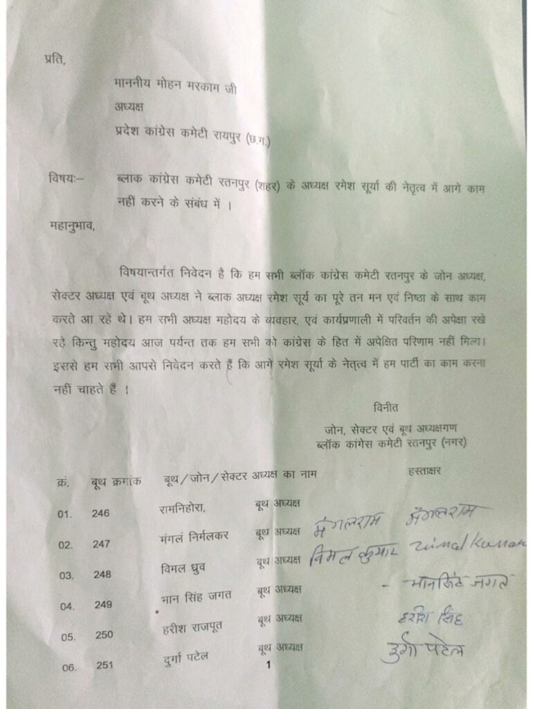 चुनावी वैतरणी को पार करने में पार्टी के निचले स्तर के कार्यकर्ता खासतौर पर, बूथ, सेक्टर स्तर के कार्यकर्ता एक बड़ी भूमिका पार्टी को जीत दिलाने में निभाते हैं। लेकिन काफी लंबे समय से रतनपुर ब्लॉक कांग्रेस अध्यक्ष रमेश सूर्या के खिलाफ कार्यकर्ता ने जिनमे सेक्टर और बूथ स्तर के कार्यकर्ता शामिल है सभी ने एक स्वर में सूर्या के साथ आगे काम करने से इंकार कर दिया है । इस मामले नाराजगी जता रहे कार्यकर्ताओं ने एक हस्ताक्षर युक्त पत्र प्रदेश अध्यक्ष मोहन मरकाम को दिया है। पत्र में लिखा गया है कि जेसी अपेक्षा कार्यकर्ता लंबे समय से ब्लॉक कांग्रेस अध्यक्ष से कर रहे थे उसके विपरीत काम किया जा रहा है। ऐसे में अब बूथ और सेक्टर प्रभारियों ने सूर्या के साथ आगे काम नहीं करने की बात रखते हुए पार्टी फोरम को अपनी मंशा से अवगत करा दिया है।