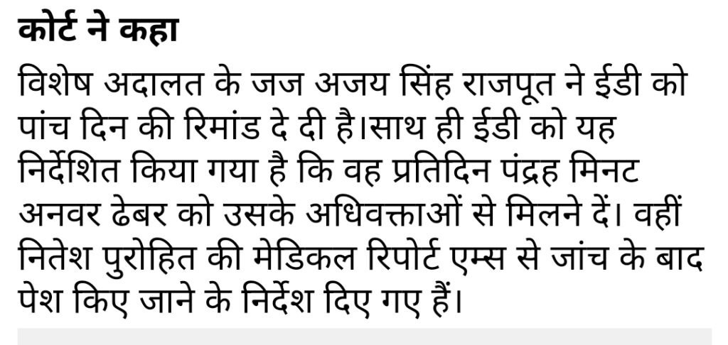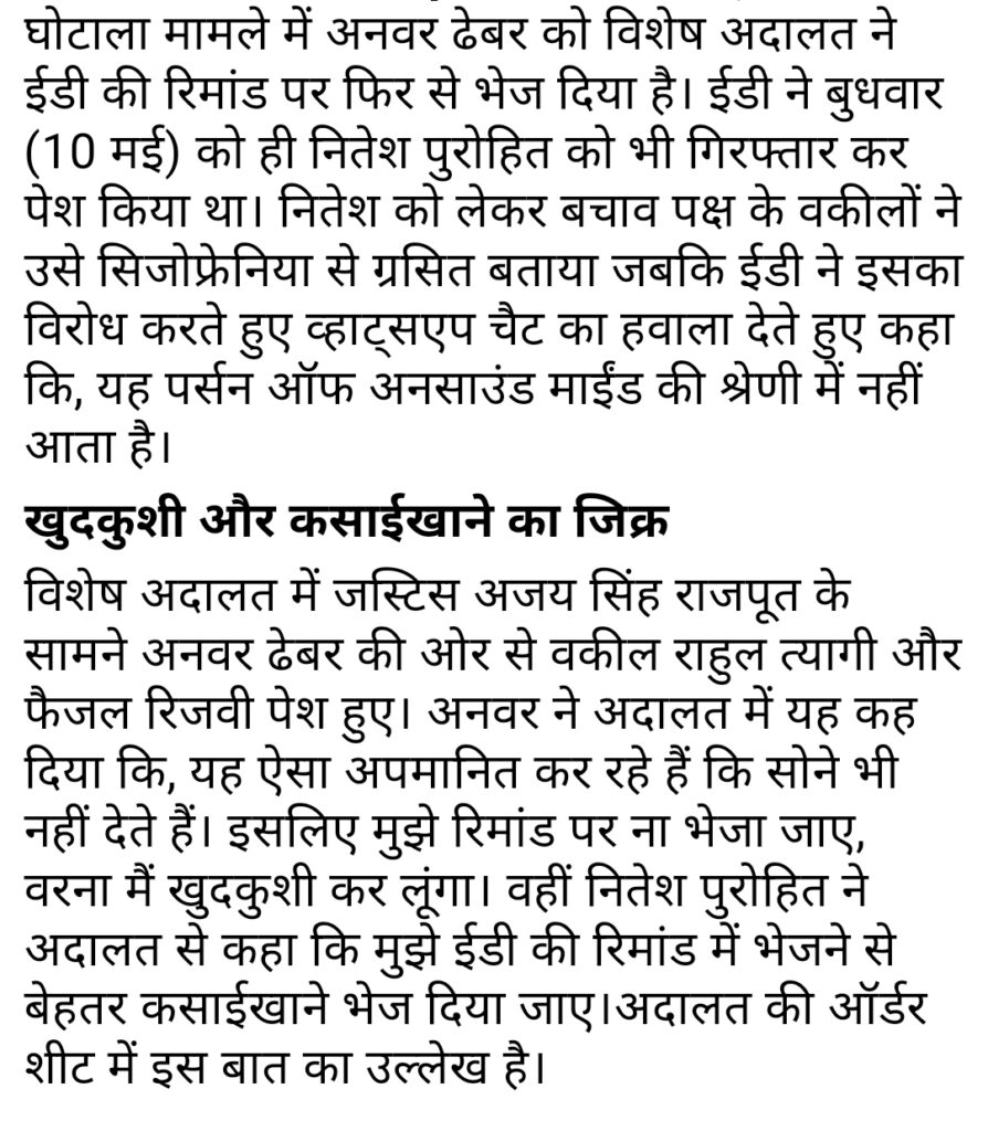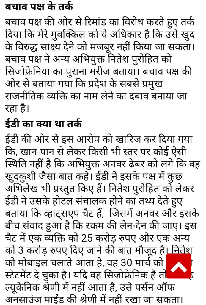 अनवर ढेबर को 5 दिन की ED को और मिली रिमांड बचाव पक्ष के अधिवक्ता और ईडी के अधिवक्ता के बीच हुई जबरदस्त बहस खुदकुशी और कसाई खाने का भी मामला उठा