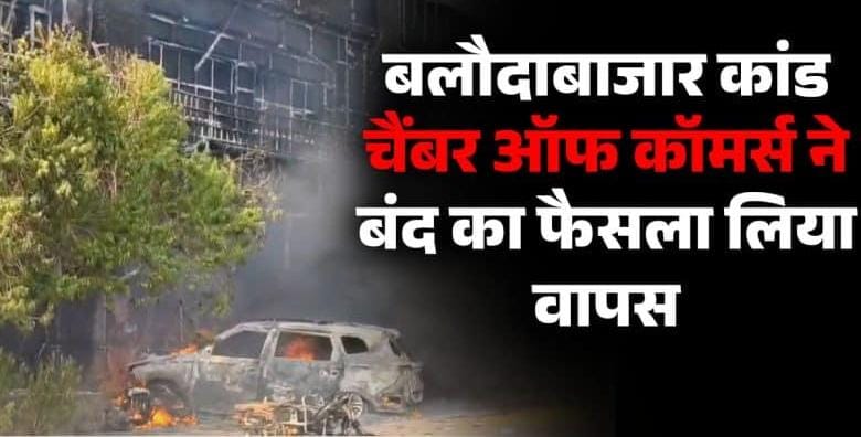 बलौदाबाजार कांड : बलौदाबाजार में हिंसा के विरोध में आज चैंबर ऑफ कॉमर्स द्वारा बंद का फैसला वापस ले लिया गया है, कलेक्टर और एसपी ने चैंबर ऑफ कॉमर्स के पदाधिकारियों के साथ बैठक कर मामले के दोषियों पर सख्त कार्रवाई का आश्वासन दिया है। जिसके बाद फैसला बदला गया है। बता दे कि चैंबर ऑफ कॉमर्स ने विरोध स्वरुप आज बंद रखने का ऐलान किया था