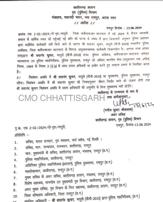 बलौदाबाजार अपडेट : – बलौदाबाजार हिंसा… कलेक्टर-SP निलंबित देर रात जारी हुआ आदेश