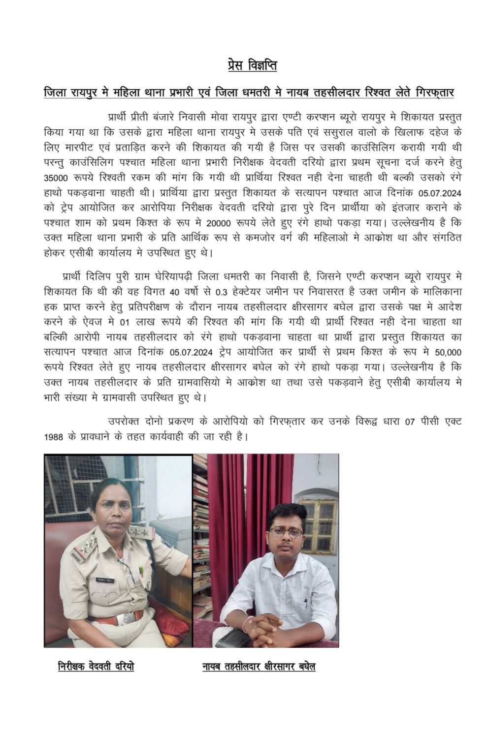 धमतरी : एंटी करप्शन ब्यूरो एसीबी की बड़ी कार्यवाही। धमतरी के नायब तहसीलदार क्षीर सागर बघेल रिश्वत लेते रंगे हाथों चढ़े एंटी करप्शन ब्यूरो के हत्थे. 50000 की ले रहे थे रिश्वत। करीब पिछले 2 घंटे से चल रही है कार्यवाही सूत्रों से मिली जानकारी के अनुसार कब्जा दिलाने की एवज में की थी पैसों की मांग ।अभी विस्तृत जानकारी निकल कर बाहर नहीं आई है ।टीम अभी भी नायब तहसीलदार बघेल से कर रही है पूछताछ। टीम का धमतरी के पूर्व टी आई सपन चौधरी कर रहे हैं नेतृत्व।