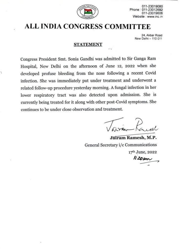 कांग्रेस प्रवक्ता जयराम रमेशन ने बताया कि, मौजूदा समय में सोनिया गांधी चिकित्सकों की सघन निगरानी में हैं। उन्होंने बताया कि कांग्रेस अध्यक्ष की निचली श्वास नली में ‘फंगल संक्रमण’ का पता चला है। उन्होंने कहा कि इस संक्रमण और कोविड-19 संक्रमण के बाद की जटिलताओं के मद्देनजर उनका उपचार किया जा रहा है।
