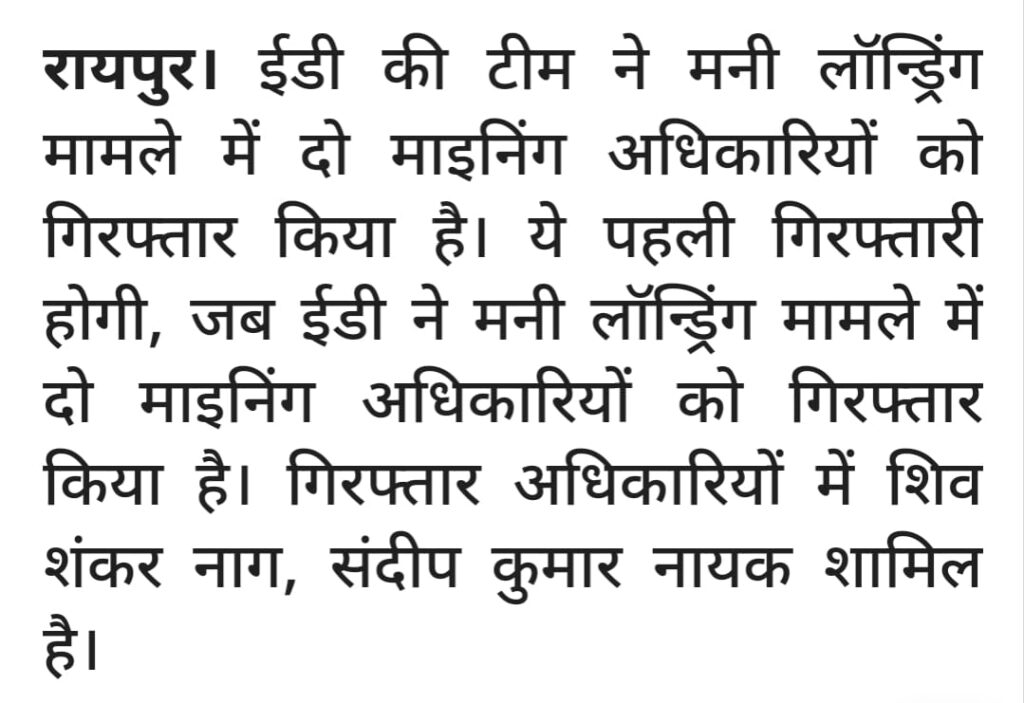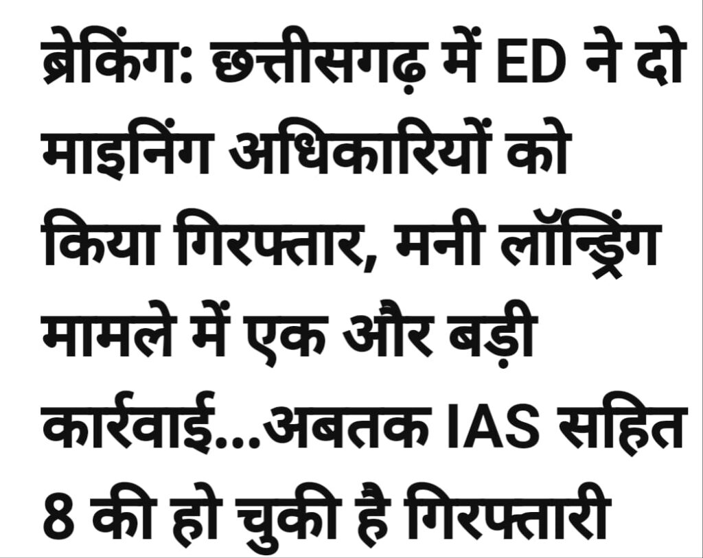 - ब्रेकिंग: छत्तीसगढ़ में ED ने माइनिंग अधिकारियों को किया गिरफ्तार,मनी लॉन्ड्रिंग मामले में एक और बड़...