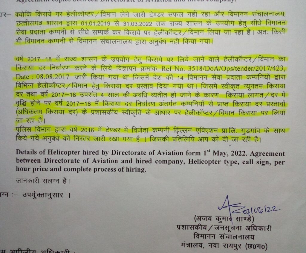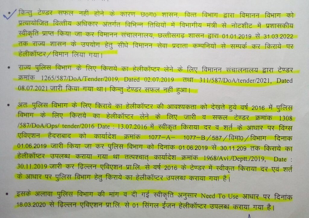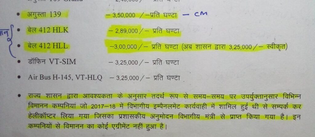 आपको जानकर हैरानी होगी कि मुख्यमंत्री बघेल और राज्य सरकार द्वारा जिस BELL-412 HLK हेलीकॉप्टर का उपयोग इन दिनों नियमित रूप से किया जा रहा है,उसका किराया विधिवत रूप से 2 लाख 65 हजार रूपए स्वीकृत है। लेकिन बघेलखण्ड को इसका भुगतान 2 लाख 89 हजार रुपए प्रति घंटा के हिसाब से किया जा रहा है। इन दस्तावेजों में हेलीकाप्टर और विमानों के लिए छत्तीसगढ़ शासन द्वारा स्वीकृत दरों का अवलोकन किया जा सकता है।