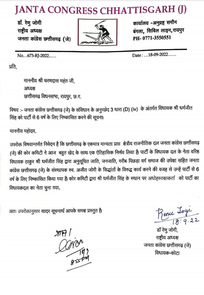 जिस पार्टी के चिन्ह पर चुनाव जीते और विधायक बने, उसी पार्टी की नीतियों को त्यागने तथा छत्तीसगढ़वाद की क्षेत्रीय विचारधारा को मिटाने का प्रयास करने के कारणवश, जनता कांग्रेस छत्तीसगढ़ (जे) लोरमी विधायक ठाकुर धरमजीत सिंह को 6 वर्षों के लिए पार्टी से निष्कासित किया गया है। विधायक धरमजीत सिंह के पार्टी से निष्कासन की सूचना विधानसभा अध्यक्ष डॉ चरणदास महंत को दे दी गई है। जनता कांग्रेस छत्तीसगढ़ (जे) विधायक धर्मजीत सिंह को निष्कासित करने का प्रस्ताव सर्वसम्मति से पारित करते हुए इस विषय में अंतिम निर्णय लेने के लिए जनता कांग्रेस छत्तीसगढ़ (जे) की राष्ट्रीय अध्यक्ष डॉ. रेणु जोगी पर छोड़ा गया है।