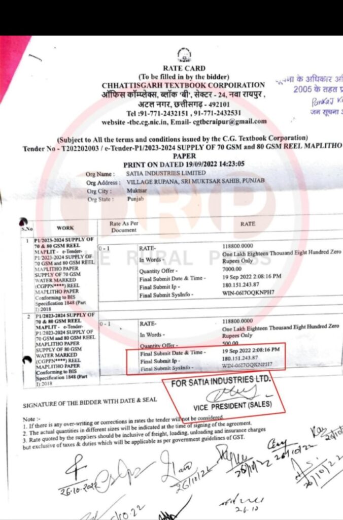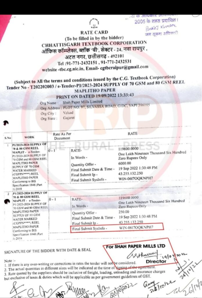 जिनमें कि गुजरात की मे. शाह पेपर मिल्स लिमिटेड, वापी, गुजरात द्वारा टेंडर के लिए लोवर रेट मिला। बता दें कि इस कंपनी ने 1,18,800 अतिरिक्त जीएसटी का रेट भरा था। सरकार ने एक लाख 13 हजार अतिरक्त जीएसटी के साथ यह टेंडर 3000 मिट्रीक टन 70 जीएसएम पेपर खरीदने के लिए गुजरात की कंपनी को दे दिया। एल1 के आधार पर बाकी 3 कंपनियों से निगोशिएशन कर लिया गया।