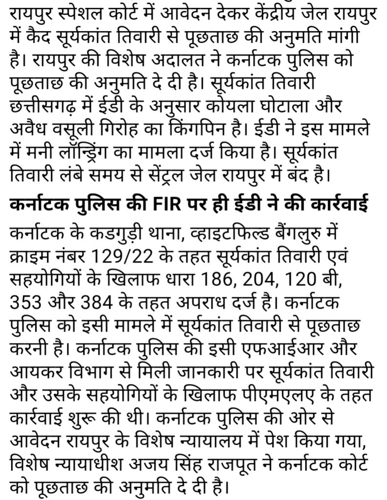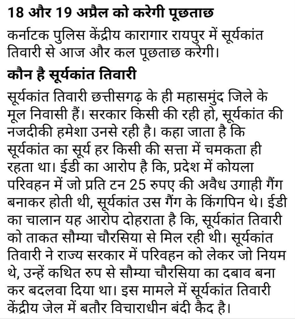 छत्तीसगढ़ पहूंची कर्नाटक पुलिस,कोयले ट्रांसपोर्टिंग में 25 रूपये प्रति टन अवैध वसूली और मनीलाड्रींग मामले में रायपुर केंद्रीय जेल में बंद सूर्यकांत तिवारी से करेंगी पूछताछ