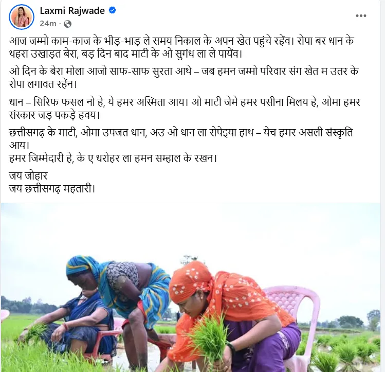 मंत्री राजवाड़े ने खेत में धान रोपते हुए अपनी तस्वीरें पोस्ट कीं और लिखा – “धान सिर्फ फसल नहीं, हमारी अस्मिता है। माटी में हमारा संस्कार है। ये संस्कृति, ये परंपरा – हमारी असली पहचान है।” उन्होंने लिखा कि उन्होंने व्यस्त कार्यक्रम से समय निकालकर अपने खेत में काम किया और लंबे समय बाद मिट्टी की महक को महसूस किया। मंत्री ने आगे लिखा: “जब परिवार के साथ खेतों में उतरकर रोपा लगाते थे, वो दिन आज भी आंखों के सामने है। हम सभी की जिम्मेदारी है कि इस विरासत को सहेजें। जय जोहार, जय छत्तीसगढ़ महतारी।”