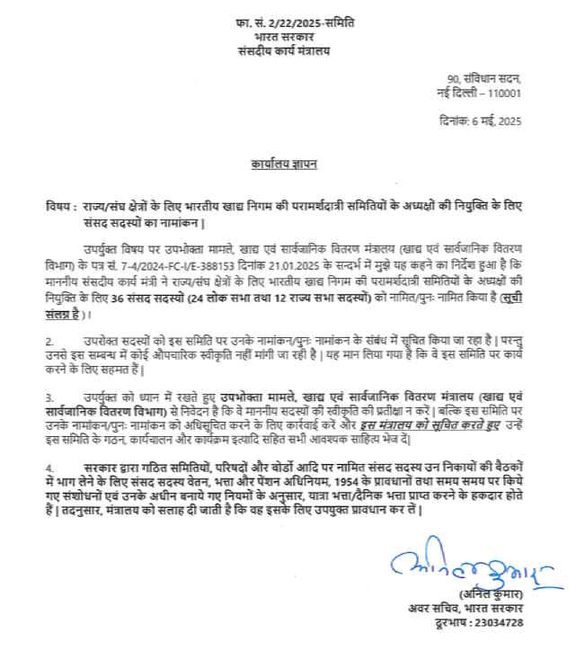 यह नियुक्ति संसदीय कार्य मंत्रालय द्वारा निर्धारित प्रक्रिया के तहत की गई है और तत्काल प्रभाव से लागू मानी गई है।नियुक्ति के बाद सांसद अग्रवाल ने भारत सरकार, उपभोक्ता मामले मंत्रालय तथा पार्टी नेतृत्व के प्रति आभार व्यक्त करते हुए कहा कि यह उनके लिए गर्व और उत्तरदायित्व दोनों का विषय है।