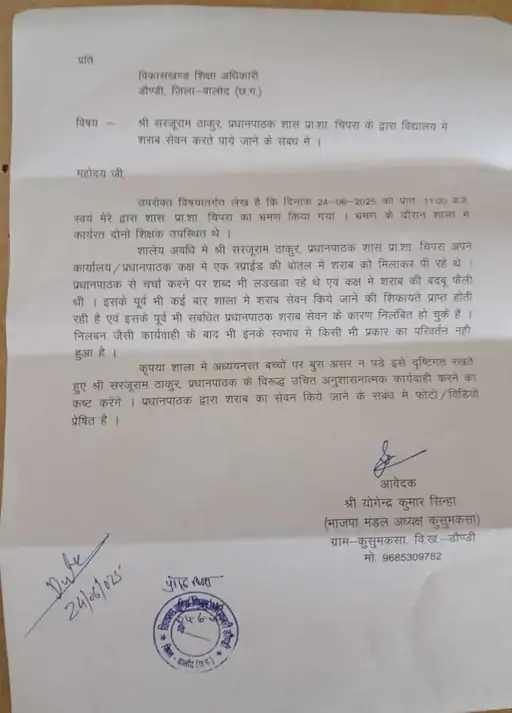 बालोद जिले के डौंडी ब्लॉक में प्राथमिक शाला के हेडमास्टर सरजू राम ठाकुर को स्कूल में शराब पीते पकड़ा गया। भाजपा नेताओं ने रंगे हाथों वीडियो सहित कार्रवाई कराई। शिक्षा विभाग ने शिक्षक को तत्काल निलंबित कर दिया है। जांच जारी है।