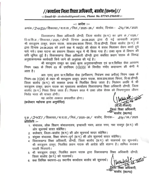 क्लास में शराब पीने का वीडियो सामने आने के बाद जिला शिक्षा अधिकारी पीसी मरकले ने प्रधानपाठक सरजू राम ठाकुर को निलंबित कर दिया गया है। विकासखंड शिक्षा अधिकारी डौंडी ने इस मामले में अनुशासनात्मक कार्रवाई की सिफारिश की थी। शराब पीना छत्तीसगढ़ सिविल सेवा आचरण नियम 1965 के नियम 03 के तहत अनुशासनहीनता और गंभीर गलत आचरण माना गया है। इसलिए छत्तीसगढ़ सिविल सेवा (वर्गीकरण, नियंत्रण और अपील) नियम 1966 के नियम-09 (1)(क) के तहत उन्हें निलंबित किया गया है। निलंबन की अवधि में उनका मुख्यालय विकासखंड शिक्षा अधिकारी डौंडी कार्यालय होगा।