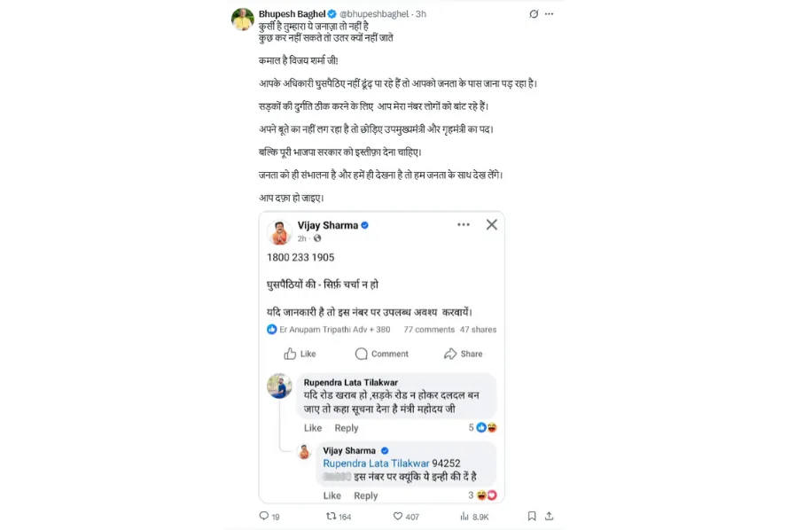 एक युवक ने कमेंट किया कि यदि सड़कों की हालत खराब हो तो शिकायत कहां करें? इस पर डिप्टी सीएम विजय शर्मा ने सार्वजनिक मंच पर जवाब देते हुए लिखा – “94252**** इस नंबर पर करें, क्योंकि ये उन्हीं की देन है।” यह नंबर पूर्व मुख्यमंत्री भूपेश बघेल का था, जो सोशल मीडिया पर वायरल हो गया और सियासत की नई चिंगारी भड़क उठी।