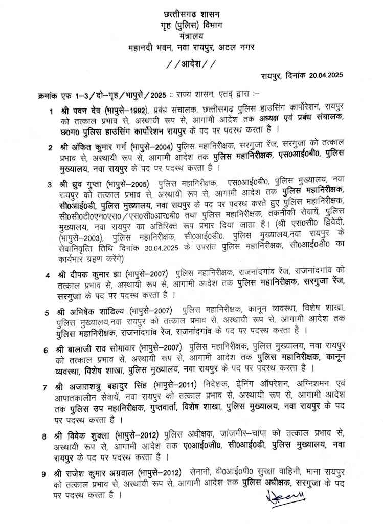 ध्रुव गुप्ता (भापुसे-2005), पुलिस महानिरीक्षक, एसआईबी, को पुलिस महानिरीक्षक, सीआईडी, नवा रायपुर बनाया गया. उन्हें सीसीटीएनएस/एससीआरबी और तकनीकी सेवाओं का अतिरिक्त प्रभार भी दिया गया है. वे 30 अप्रैल 2025 के बाद सीआईडी का कार्यभार ग्रहण करेंगे.