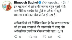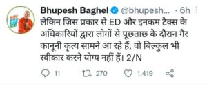 :आइए जानें श्री बघेल ने क्या कहा: प्रदेश के मुख्यमंत्री भूपेश बघेल ने ED और IT के अधिकारियों को सख्त लहजे में चेतावनी दी है। अपने फेसबुक पेज और ट्विटर के माध्यम से