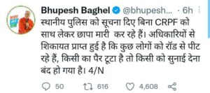 स्थानीय पुलिस को सूचना दिए बिना CRPF को साथ लेकर छापा मारी कर रहे हैं। अधिकारियों से शिकायत प्राप्त हुई है कि कुछ लोगों को रॉड से पीट रहे हैं, किसी का पैर टूटा है तो किसी को सुनाई देना बंद हो गया है।