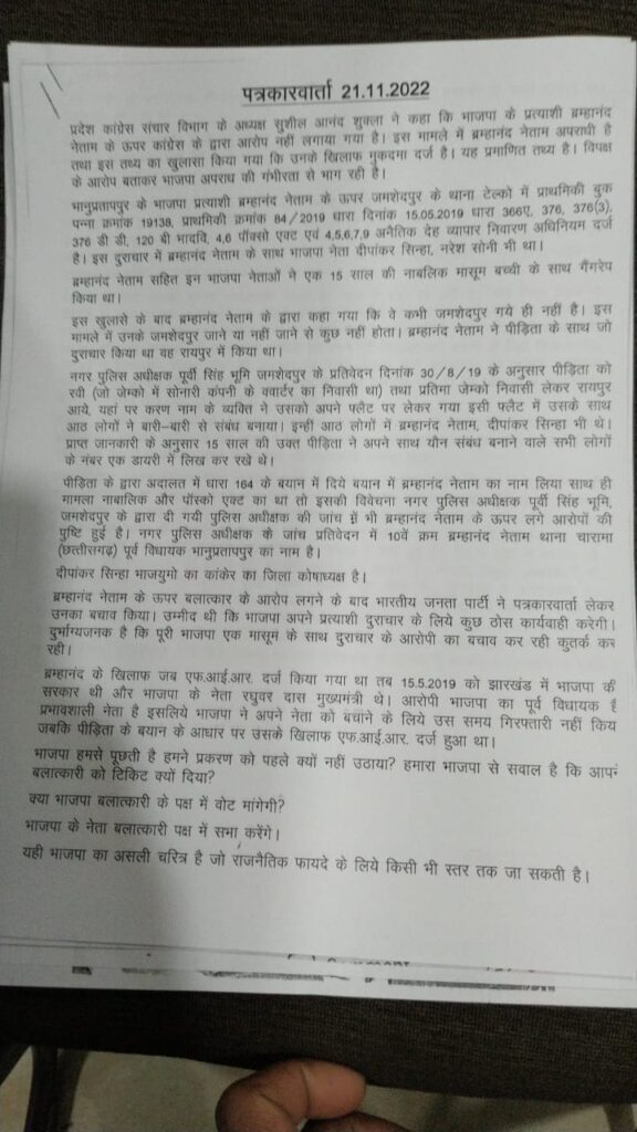 रायपुर : प्रदेश कांग्रेस संचार विभाग के अध्यक्ष सुशील आनंद शुक्ला ने पत्रकार वार्ता को संबोधित करते हुये कहा कि भाजपा के प्रत्याशी ब्रह्मानंद नेताम के ऊपर कांग्रेस के द्वारा आरोप नहीं लगाया गया है। इस मामले में ब्रह्मानंद नेताम अपराधी है तथा इस तथ्य का खुलासा किया गया कि उनके खिलाफ मुकदमा दर्ज है। यह प्रमाणित तथ्य है। विपक्ष के आरोप बताकर भाजपा अपराध की गंभीरता से भाग रही है। भानुप्रतापपुर के भाजपा प्रत्याशी ब्रह्मानंद नेताम के ऊपर जमशेदपुर के थाना टेल्को में प्राथमिकी बुक पन्ना क्रमांक 19138, प्राथमिकी क्रमांक 84/2019 धारा दिनांक 15.05.2019 धारा 366ए, 376, 376(3), 376 डी डी, 120 बी भादवि, 4,6 पॉक्सो एक्ट एवं 4, 5, 6, 7, 9 अनैतिक देह व्यापार निवारण अधिनियम दर्ज है।