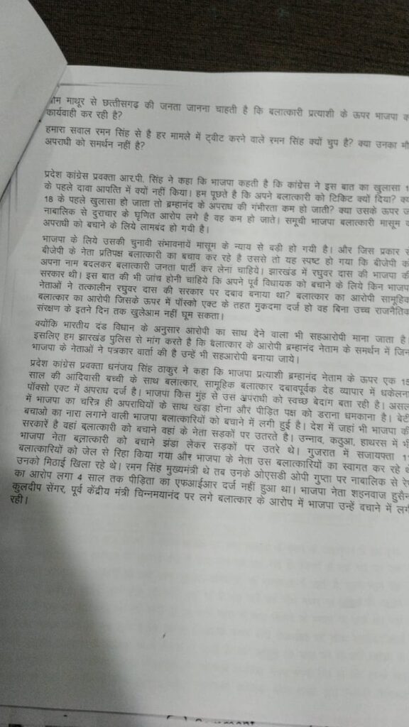 भाजपा के लिये उसकी चुनावी संभावनायें मासूम के न्याय से बड़ी हो गयी है। और जिस प्रकार से बीजेपी के नेता प्रतिपक्ष बलात्कारी का बचाव कर रहे है उससे तो यह स्पष्ट हो गया कि बीजेपी को अपना नाम बदलकर बलात्कारी जनता पार्टी कर लेना चाहिये। झारखंड में रघुवर दास की भाजपा की सरकार थी। इस बात की भी जांच होनी चाहिये कि अपने पूर्व विधायक को बचाने के लिये किन भाजपा नेताओं ने तत्कालीन रघुवर दास की सरकार पर दबाव बनाया था? बलात्कार का आरोपी सामूहिक बलात्कार का आरोपी जिसके ऊपर में पॉस्को एक्ट के तहत मुकदमा दर्ज हो वह बिना उच्च राजनैतिक संरक्षण के इतने दिन तक खुलेआम नहीं घूम सकता। प्रदेश कांग्रेस प्रवक्ता धनंजय सिंह ठाकुर ने कहा कि भाजपा प्रत्याशी ब्रम्हानंद नेताम के ऊपर एक 15 साल की आदिवासी बच्ची के साथ बलात्कार, सामूहिक बलात्कार दबावपूर्वक देह व्यापार में धकेलना पॉक्सो एक्ट में अपराध दर्ज है।
