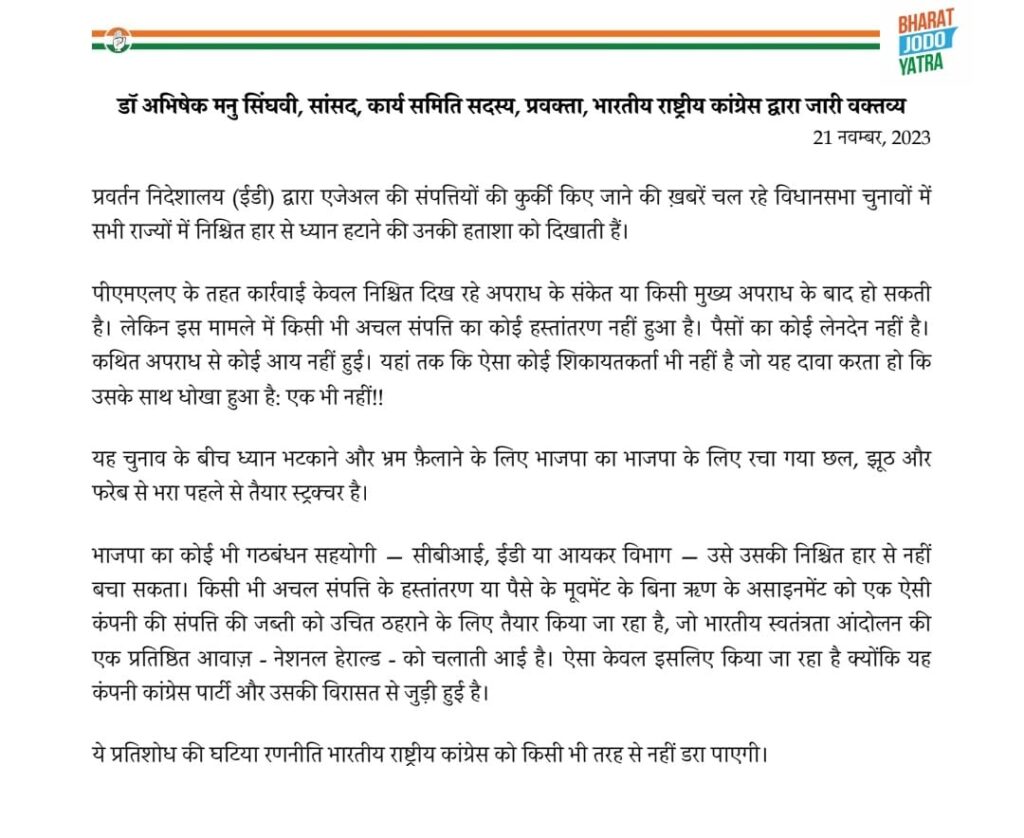 नेशनल हेराल्ड केस में ED की बड़ी कार्रवाई, 751.9 करोड़ की संपत्ति जब्त, कांग्रेस नेता मनु सिंघवी ने भाजपा पर साधा निशाना