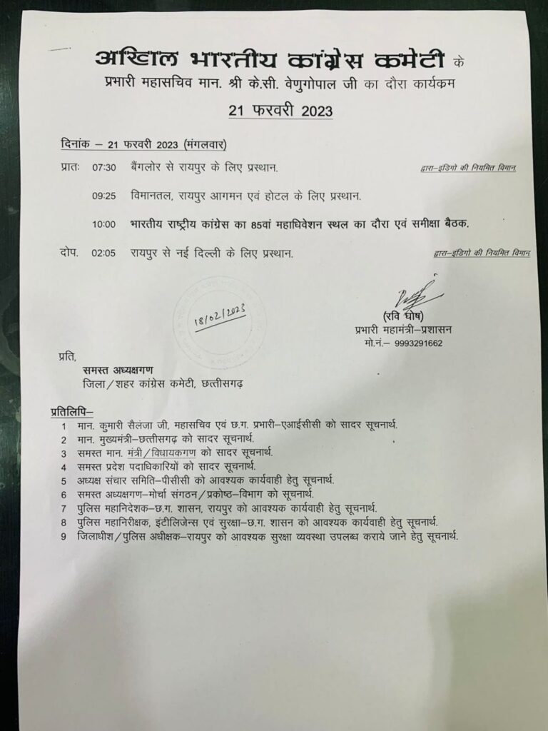 इसके अलावा अखिल भारतीय कांग्रेस कमेटी के महासचिव के.सी. वेणुगोपाल 21 फरवरी को अधिवेशन की तैयारी और कार्यस्थल का जायजा लेने के लिए रायपुर आ रहे हैं।