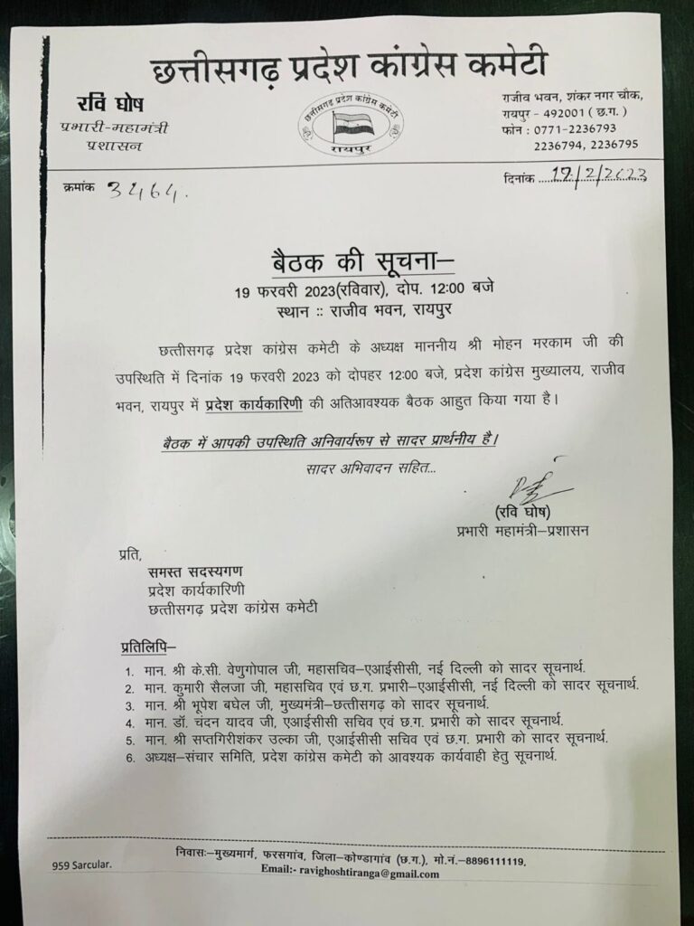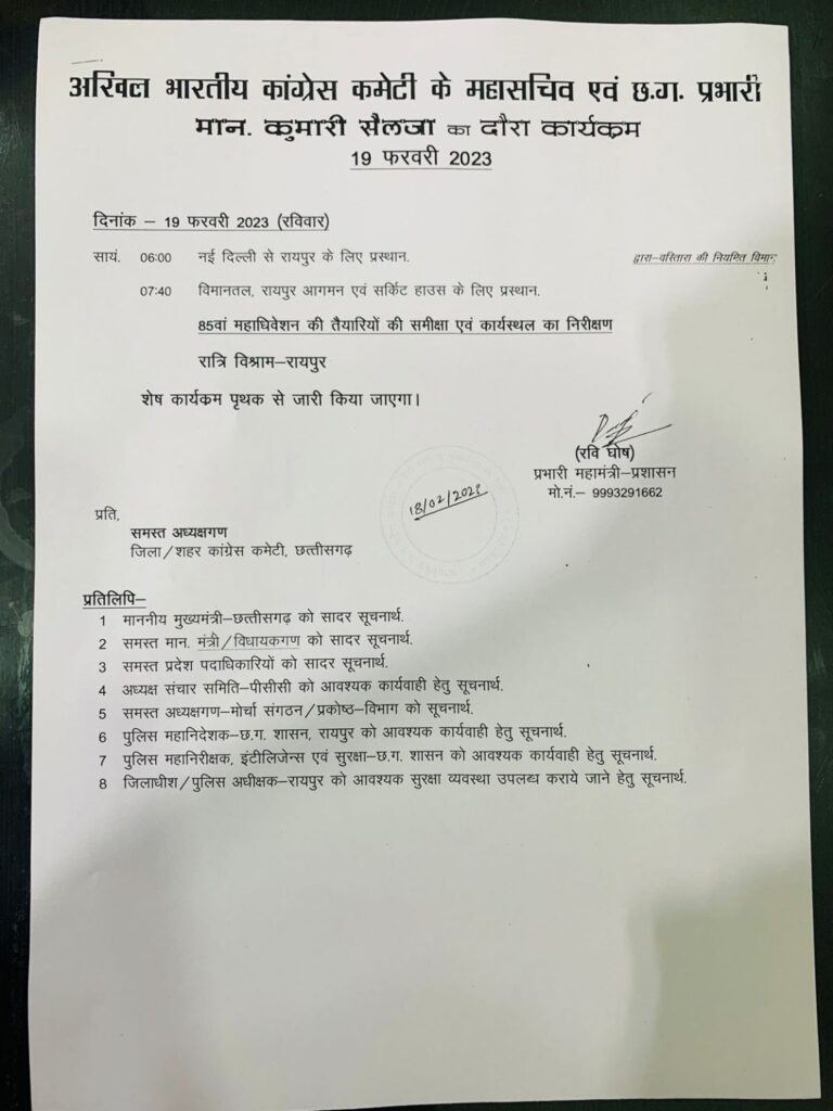 रायपुर : कांग्रेस के राष्ट्रीय अधिवेशन को लेकर बैठकों और शीर्ष नेताओं के प्रवास का दौर लगातार जारी है. इसी बीच प्रदेश प्रभारी कुमारी सैलजा रविवार को तैयारियों का जायजा लेने के लिए छत्तीसगढ़ आ रही हैं. वहीं पीसीसी चीफ मोहन मरकाम ने भी रविवार को राजीव भवन में प्रदेश कार्यकारिणी की बैठक बुलाई है ।