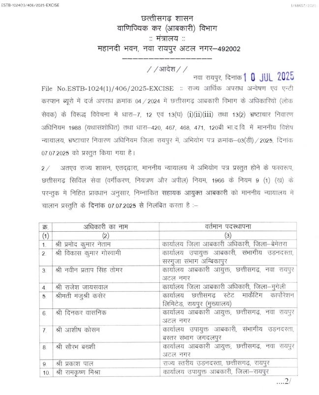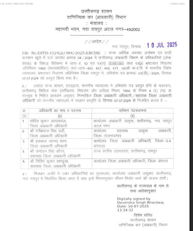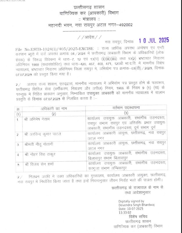 छत्तीसगढ़ शराब घोटाला मामला : राज्य सरकार की बड़ी कार्रवाई, 22 आबकारी अधिकारी निलंबित, आदेश जारी