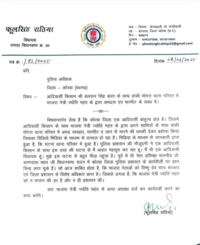 रामपुर विधायक फूलसिंह राठिया ने कोरबा पुलिस अधीक्षक को पत्र लिखकर ज्योति महंत पर कार्रवाई की मांग की है। उन्होंने कहा कि थाना परिसर में आदिवासी किसान के साथ अभद्र व्यवहार का वीडियो देखकर वे आहत हैं। एक आदिवासी विधायक होने के नाते उन्हें लगता है कि ज्योति को न शासन का डर है, न प्रशासन का। उन्होंने इस मामले में अपराध दर्ज कर त्वरित कार्रवाई की मांग की।