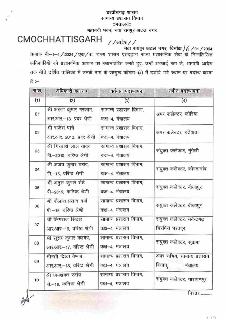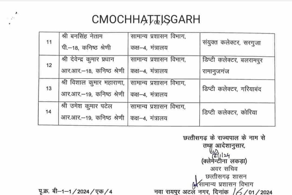 बुधवार को ही राज्य प्रशासनिक सेवा के 14 अफसरों का तबादला किया गया है।अधिकारियों को सुकमा, बीजापुर, नारायणपुर, कोरिया व रामानुजगंज भेजा गया है। इनमें सूरज कश्यप की पोस्टिंग सुकमा की गई है। सभी 14 अधिकारी सामान्य प्रशासन विभाग में पदस्थ थे। इनमें अरुण कुमार मरकाम कोरिया, राजेश पात्रे दंतेवाड़ा, गिरधारी लाल यादव मुंगेली, अजय कुमार उरांव कोंडागांव, अतुल कुमार शेटे बीजापुर, कैलाश प्रसाद वर्मा बीजापुर, लिंगराज सिदार मनेंद्रगढ़, सूरज कुमार कश्यप सुकमा, जयशंकर उरांव नारायणपुर, बनसिंह नेताम सरगुजा, देवेन्द्र कुमार प्रधान बलरामपुर, विशाल कुमार महाराणा गरियाबंद, उमेश कुमार पटेल को कोरिया भेजा गया है। जबकि दिव्या वैष्णव को सामान्य प्रशासन में ही पदस्थ किया गया है।