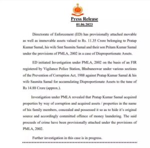 एक अधिकारी ने कहा, पीएमएलए के तहत जांच से पता चला है कि प्रताप ने भ्रष्टाचार के माध्यम से संपत्तियों का अधिग्रहण किया और अपने परिवार के सदस्यों के नाम पर संपत्ति अर्जित की, छुपाया और इसे अपने मूल स्रोत को छिपाने के लिए रखा और तदनुसार मनी लॉन्ड्रिंग का अपराध किया। मामले में आगे की जांच जारी है।