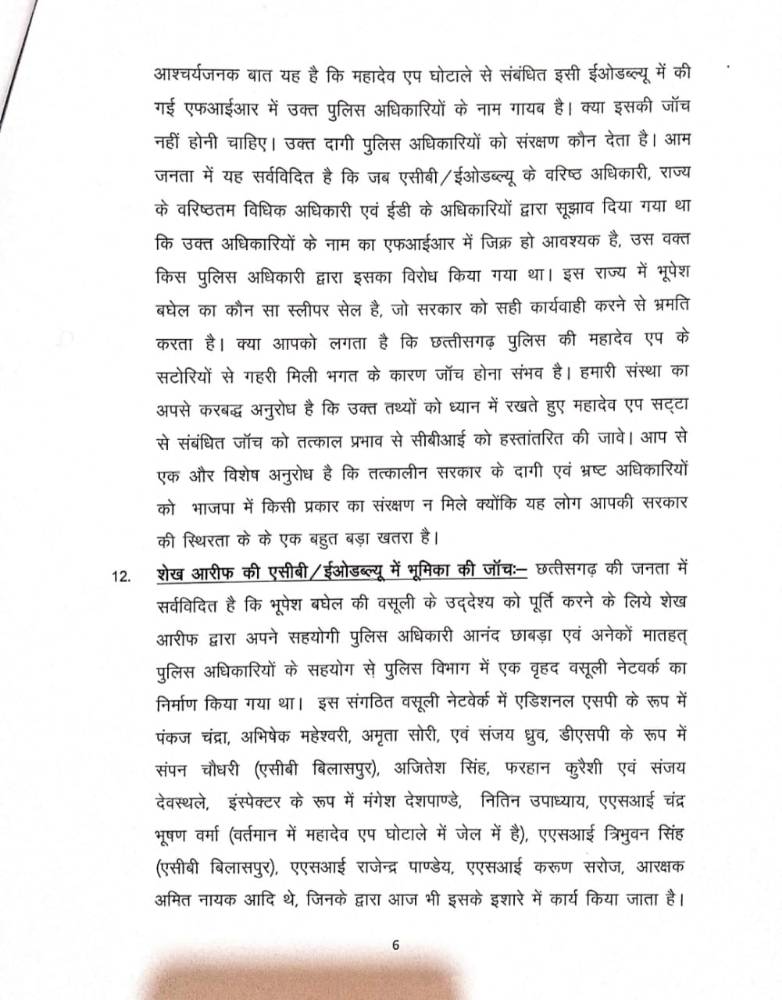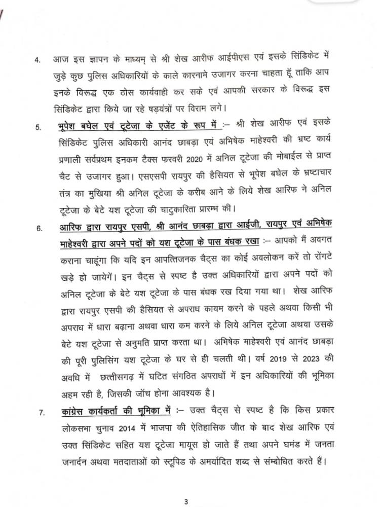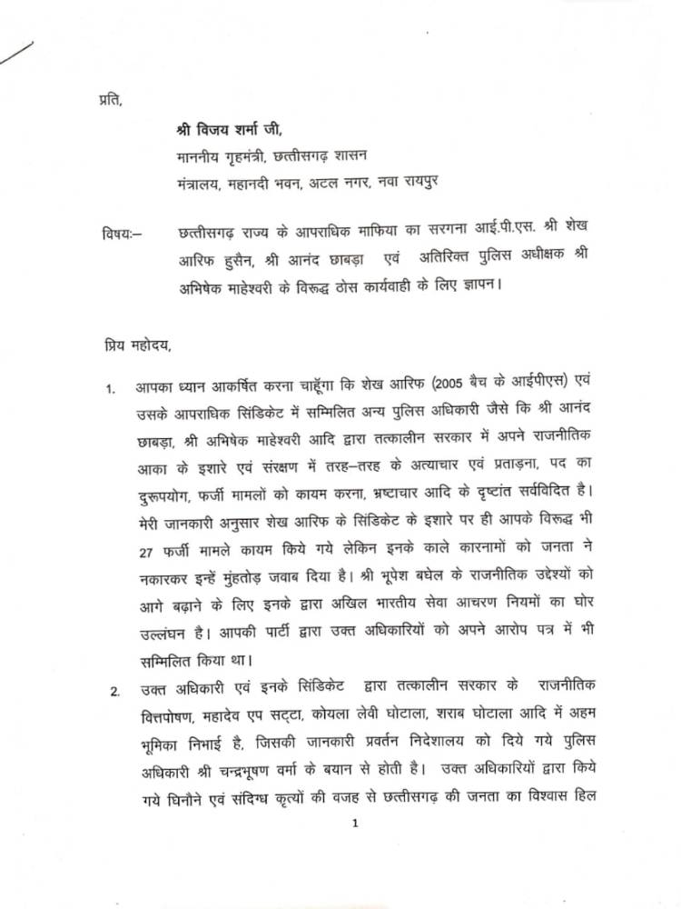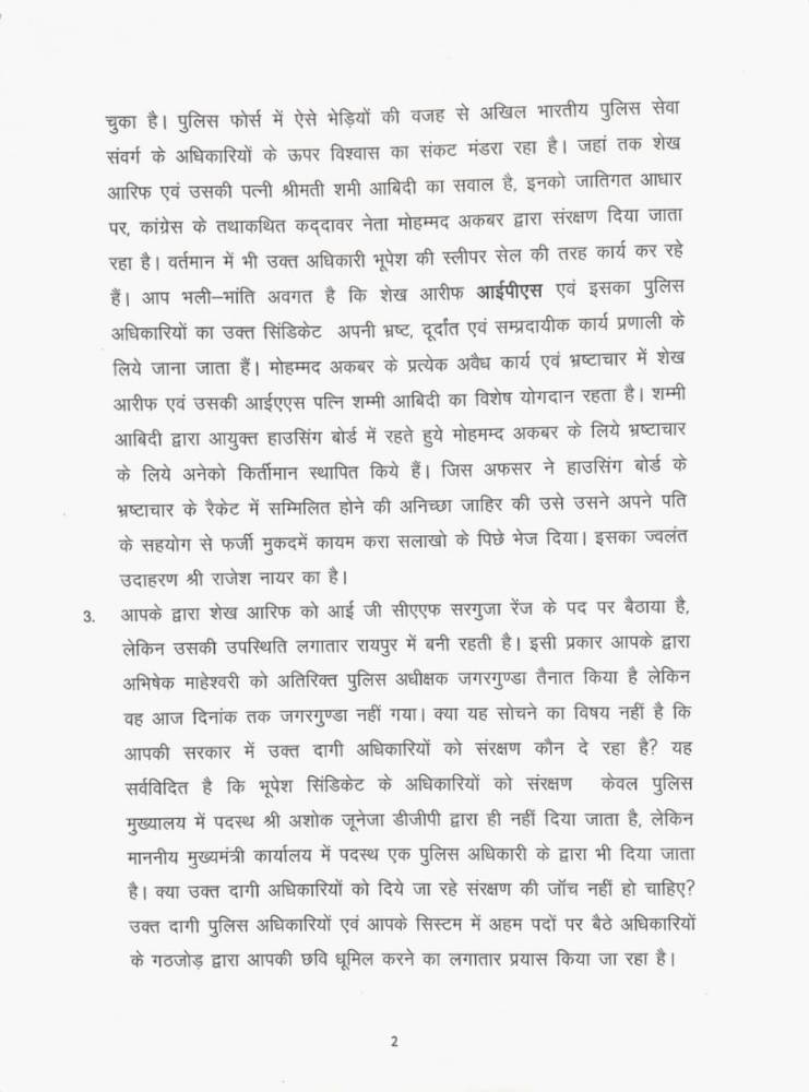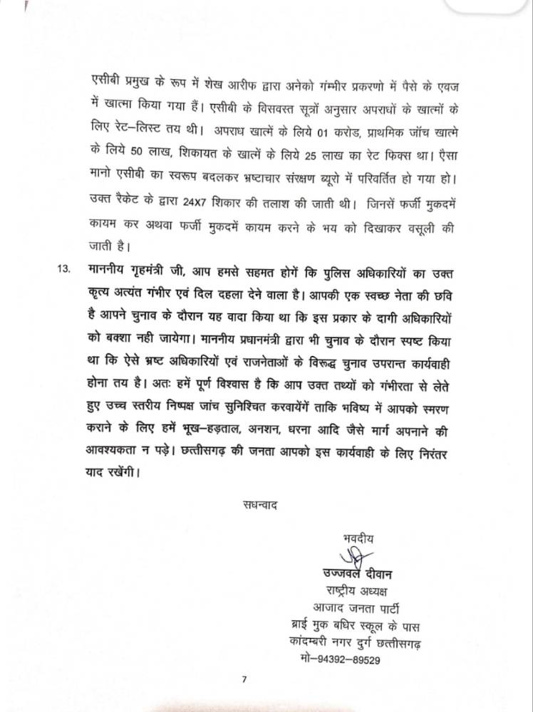 उज्जवल दीवान ने अपने ज्ञापन में IPS आरिफ शेख और उनकी IAS पत्नी शम्मी आबिदी की कार्यप्रणाली पर भी सवाल उठाए। उन्होंने बताया कि ये अधिकारी साम्प्रदायिक एजेंडा को बढ़ावा देने के लिए कार्य कर रहे थे। इसके साथ ही, उज्जवल ने बताया कि इन अधिकारियों ने पूर्व मुख्यमंत्री बघेल और अनिल टुटेजा के एजेंट के रूप में कार्य करते हुए अपने पद का गलत उपयोग किया और अवैध वसूली की।