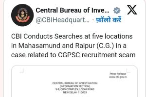 Raipur/ छत्तीसगढ़ लोक सेवा आयोग (CGPSC) भर्ती घोटाला मामले में CBI ने गुरुवार को पांच ठिकानों पर छापामार कार्रवाई की थी. इस मामले की जांच को लेकर सीबीआई ने बयान जारी किया है. सीबीआई के मुताबिक, रायपुर में तीन