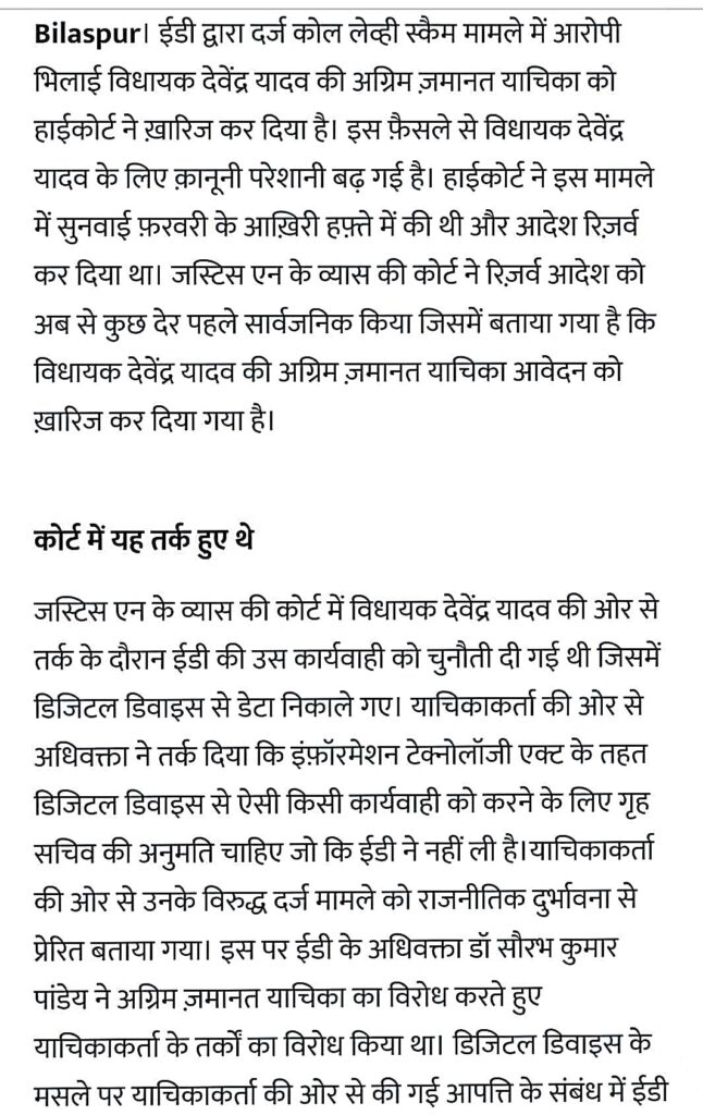 कोल लेवी स्कैम मामले में आरोपी भिलाई शहर विधायक देवेन्द्र यादव की अग्रिम जमानत याचिका को माननीय उच्च न्यायालय ने किया आज खारिज अब लटकी गिरफ्तारी की तलवार