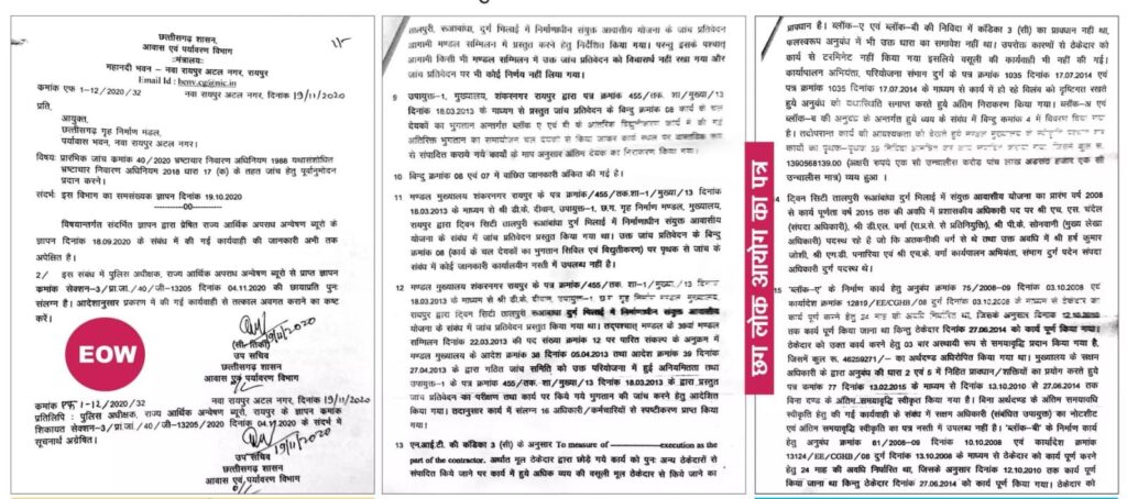 ठेकेदार को लाभ पहुंचा कर कमाया मुनाफा जांच को प्रभावित करने कई बार हाऊसिंग बोर्ड के रिकार्ड शाखा में लगा चुके है आग हाऊसिंग बोर्ड के भ्रष्ट अधिकारियों का गिरोह निजी फायदे के लिए शासन को लगा रहा चूना 1000 हजार करोड़ तालपुरी प्रोजेक्ट में भौतिक सत्यापन क्यों नहीं प्रोजेक्ट के हिसाब से मकानों की संख्या कम है यह अत्यंत गंभीर और जांच की विषय भी है हाऊसिंग बोर्ड के इस बड़े घोटाले में भूपेश सरकार ने तीनों भ्रष्ट अधिकारियों को न सिर्फ पदोन्नति दी अपितु अच्छे से अच्छे जगह पर पदस्थापना कर लूट की खुली छूट दे दी और जेल जाने से बचाए रखा जनता का हजारों करोड़ रुपया फिर से इन भ्रष्ट अधिकारियों के जेब में गया। अब तीनों अधिकारी हाऊसिंग बोर्ड के मुख्यालय में बैठ कर मौज कर रहे है, और सरकार के व्दारा जांच के प्रभावित करने के नए -नए तरीके अपना रहे है, जैसे कि ईओडब्ल्यू की जांच के दस्तावेज मुख्यालय में कमिश्नर तक पहुंचने से पहले दबा दिए जा रहे है वैसे ही लोकायुक्त छत्तीसगढ़ तीनों भ्रष्ट अधिकारियों की शिकायत की जांच और बयान अंतिम चरणों में है, छत्तीसगढ़ लोकायुक्त में भी गृह निर्माण मंडल ने अपने जवाब में स्पष्ट किया है कि हजारों करोड़ के घोटाले से संबंधित सभी परियोजना -तालपुरी भिलाई, अभिलाषा परिसर बिलासपुर, हिमालयन हाईट्स डूमरतराई जैसे महत्वपूर्ण योजनाओं के सभी दस्तावेज विभाग के पास उपलब्ध नहीं है। लोकायुक्त में दिए गए दस्तावेज और ईओडब्ल्यू व्दारा दिए गए नोटिस को जनता से रिश्ता प्रमुखता से प्रकाशित कर रहा है। विभागीय जांच में दोषी पाए गए तीनों भ्रष्ट अधिकारी हाउसिंग बोर्ड में अभी भी भ्रम फैला रहे है कि कका भूपेश सरकार में हमारा कुछ भी नहीं बिगड़ा और हम जांच को रोके रहे, अपने हिसाब से चलाते रहे तीनों अधिकारी मिलकर अफवाह फैला रहे हैं कि वर्तमान सरकार में हमारी सेटिंग और तगड़ी है और हम किसी भी कीमत में तालपुरी घोटाला, हिमालयन हाईट्स, अभिलाषा परिसर घोटाले की जांच नहीं होने देंगे। रहा सवाल फाइलों का जो हमने रफा-दफा कर चुके है। इसी बात की पुष्टि भी गृहनिर्माण मंडल ने छग लोकायुक्त को लिखित में प्रेषित किया है।