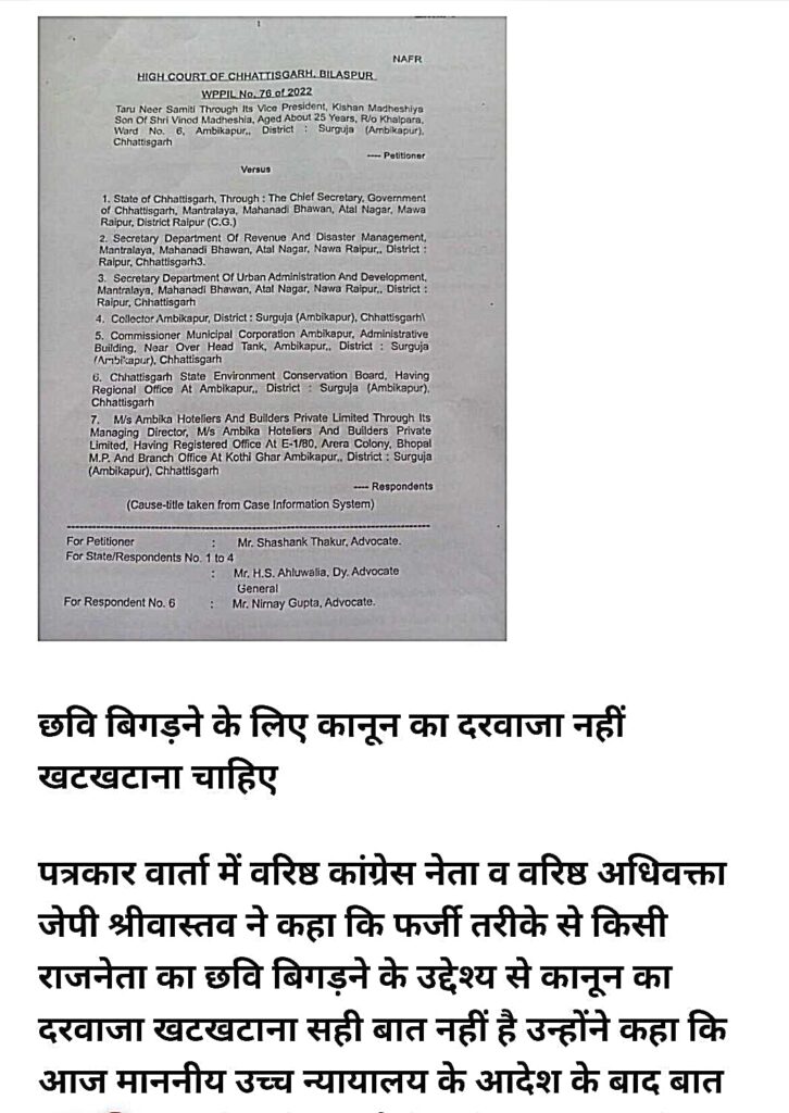 शिवसागर बांध के मामले में माननीय उच्च न्यायालय ने छत्तीसगढ़ के उप मुख्यमंत्री टी एस सिंह देव के पक्ष में फैसला देते हुए याचिका खारिज किया तीन वरिष्ठ वकीलों ने पत्रकार वार्ता में यह जानकारी दी अंबिकापुर : छत्तीसगढ़ के