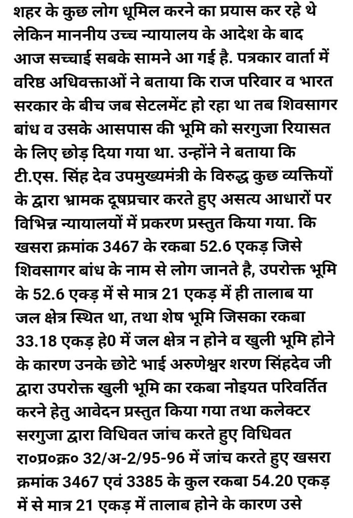 - शिवसागर बांध के मामले में माननीय उच्च न्यायालय ने छत्तीसगढ़ के उप मुख्यमंत्री टी एस सिंह देव के पक्ष...
