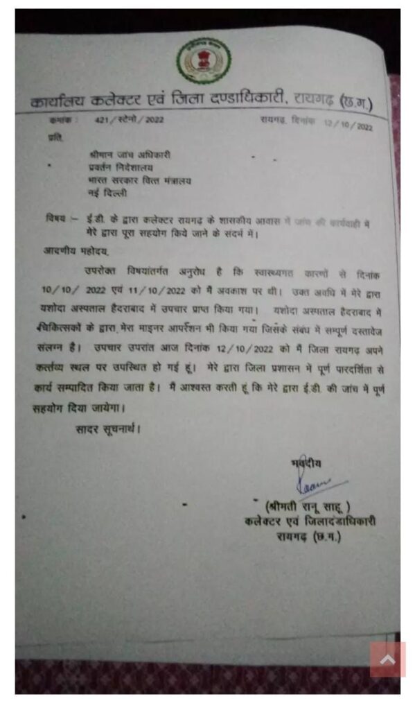 यह भी बताया है कि कई घंटो तक अपने दफ्तर और बंगले से नदारत रही रानू साहू की दलीलों की तस्दीक भी ED ने की है। जानकारी के मुताबिक घंटो गायब रही रानू साहू ने ED को पत्र लिखकर सूचित किया था कि वे इलाज के लिए हैदराबाद गई हुई थी।