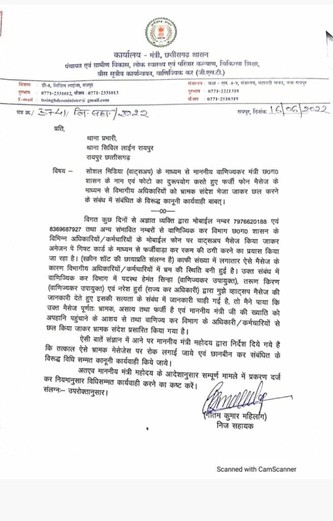 इस शिकायत में बताया गया है कि सोशल मिडिया (वाट्सअप) के माध्यम से वाणिज्यकर मंत्री टी एस सिंहदेव के नाम एवं उनकी फोटो का दुरूपयोग करते हुए दो फर्जी मोबाइल नंबर से फोन मैसेज के माध्यम से विभागीय अधिकारियों को भ्रामक संदेश भेजकर उनसे छल करने का प्रयास किया जा रहा है। जिसमें कुछ दिनों से अज्ञात व्यक्ति द्वारा मोबाईल नम्बर 7976620188 एवं 8369687927 तथा अन्य संभावित नम्बरों से वाणिज्यिक कर विभाग के विभिन्न अधिकारियों / कर्मचारियों के मोबाईल फोन पर वाट्सअप मैसेज किया गया है, जिसमें उनसे अमेजन-पे (Amazon Pay) गिफ्ट कार्ड के माध्यम से फर्जीवाड़ा कर रकम की ठगी करने का प्रयास किया जा रहा है।