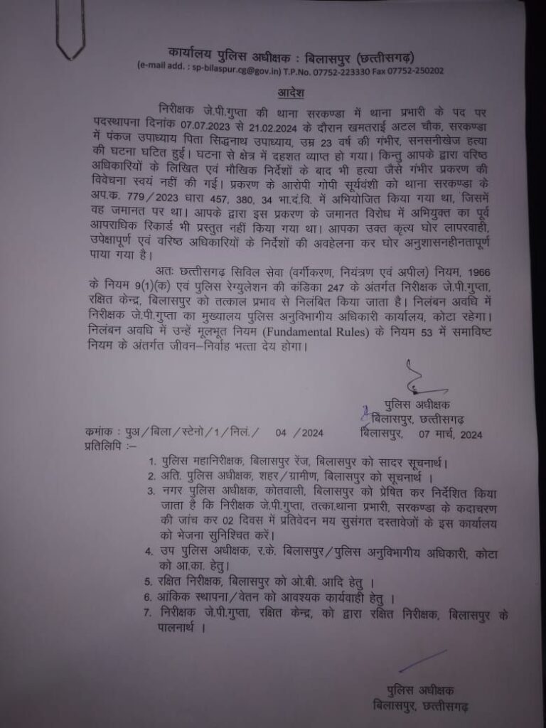- अधिकारियों की अवहेलना और कार्य में लापरवाही पड़ा जेपी गुप्ता को भारी पुलिस अधीक्षक ने किया निलंबित