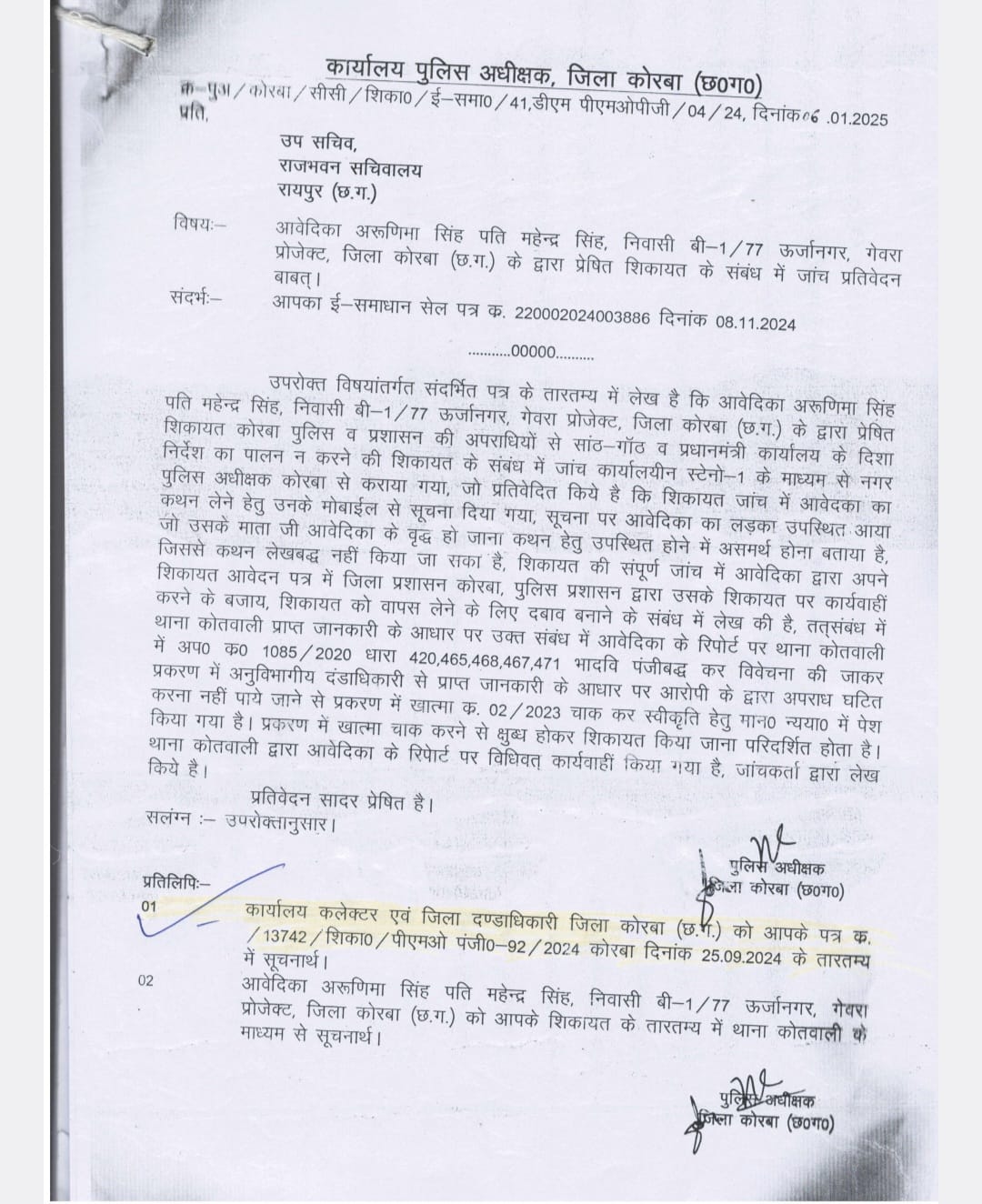 पुलिस अधीक्षक कार्यालय, कोरबा द्वारा राजभवन सचिवालय रायपुर को भेजी गई जांच रिपोर्ट में, शिकायतकर्ता अरुणिमा सिंह की ओर से प्रशासन व पुलिस पर लगाए गए सांठगांठ और दबाव बनाने के आरोपों को खारिज कर दिया गया है। यह रिपोर्ट प्रधानमंत्री कार्यालय (PMO) के ई-समाधान पोर्टल पर दर्ज शिकायत के संदर्भ में तैयार की गई।
