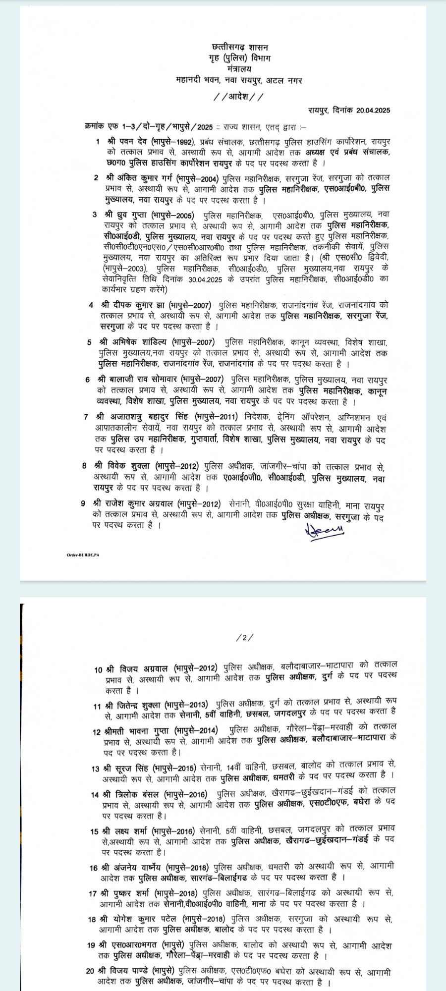 - छत्तीसगढ़ पुलिस में बड़ा फेरबदल, 20 IPS अधिकारियों का तबादला