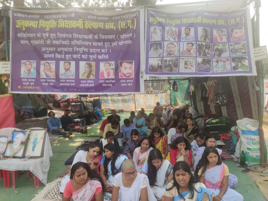 अनुकम्पा नियुक्ति शिक्षाकर्मी कल्याण संघ के बैनर तले दिवंगत पंचायत शिक्षकों की विधवाओं ने अपनी 1 सूत्रीय मांग अनुकंपा नियुक्ति को लेकर सड़क की लड़ाई लड़ने को मजबूर है। राजधानी रायपुर के बूढ़ा तालाब धरना स्थल पर दिवंगत पंचायत शिक्षकों के परिजन अनिश्चितकालीन हड़ताल पर बैठे हुए हैं। 24 अक्टूबर से आमरण अनशन की शुरुआत भी हो गई है। इस आमरण अनशन में बैठी विधवाओं की तबीयत भी कई बार खराब हो चुकी है। और कुछ को हॉस्पिटल में भी इलाज करवाना पड़ रहा है। कांग्रेस ने सरकार बनते ही इनको अनुकंपा नियुक्ति देने का वादा किया था, लेकिन सरकार बने लगभग 4 साल बीत चुके हैं, बावजूद इसके आज तक दिवंगत पंचायत शिक्षकों के परिजनों को अनुकंपा नियुक्ति नहीं मिल पाई।