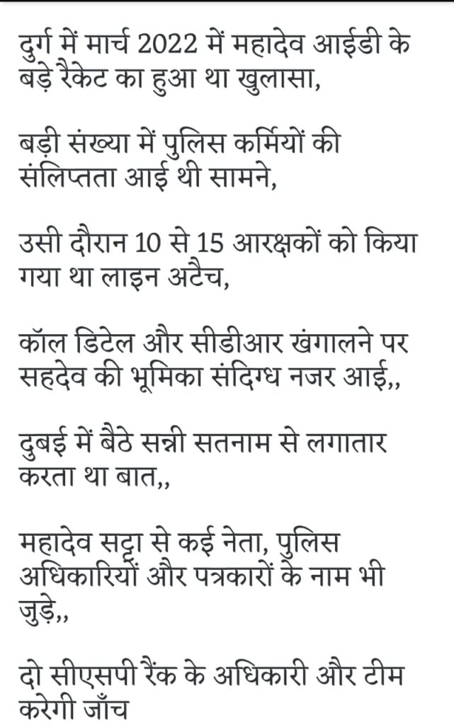एसपी अभिषेक पल्लव ने सिपाही सहदेव को महादेव ऑनलाइन सट्टा एप में शामिल होने के चलते सस्पेंड कर दिया है। उस पर आरोप है कि वह साल 2021 से अब तक कई महीने तक बिना किसी सूचना के गायब रहा। उसकी लगातार महादेव एप के संचालकों से बातचीत होती थी और वह खुद भी इसमें शामिल था। इसकी जांच के लिए दो आईपीएस अधिकारियों को लगाया गया है। दुर्ग एसपी डॉ. अभिषेक पल्लव ने बताया कि दुर्ग में मार्च 2022 में महादेव आईडी के बड़े रैकेट का खुलासा हुआ था। इसमें बड़ी संख्या में पुलिसकर्मियों के शामिल होने की बात सामने आई थी।