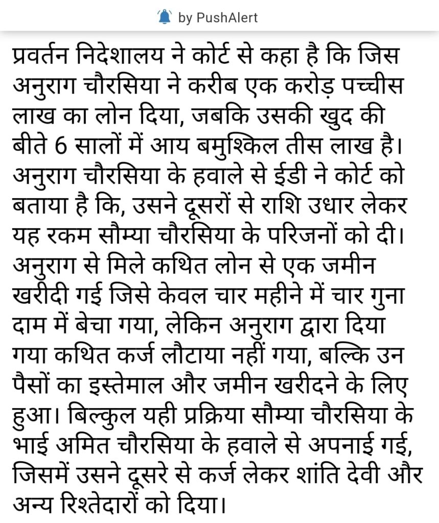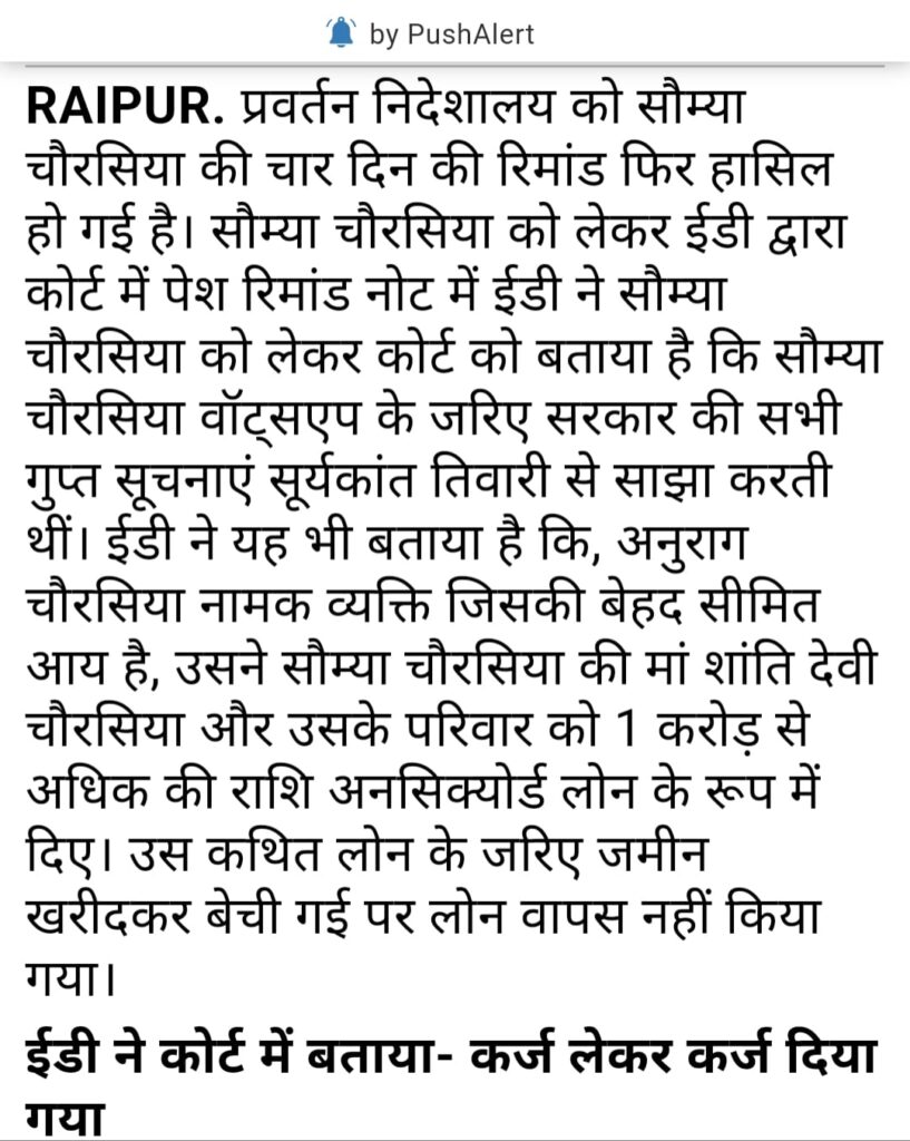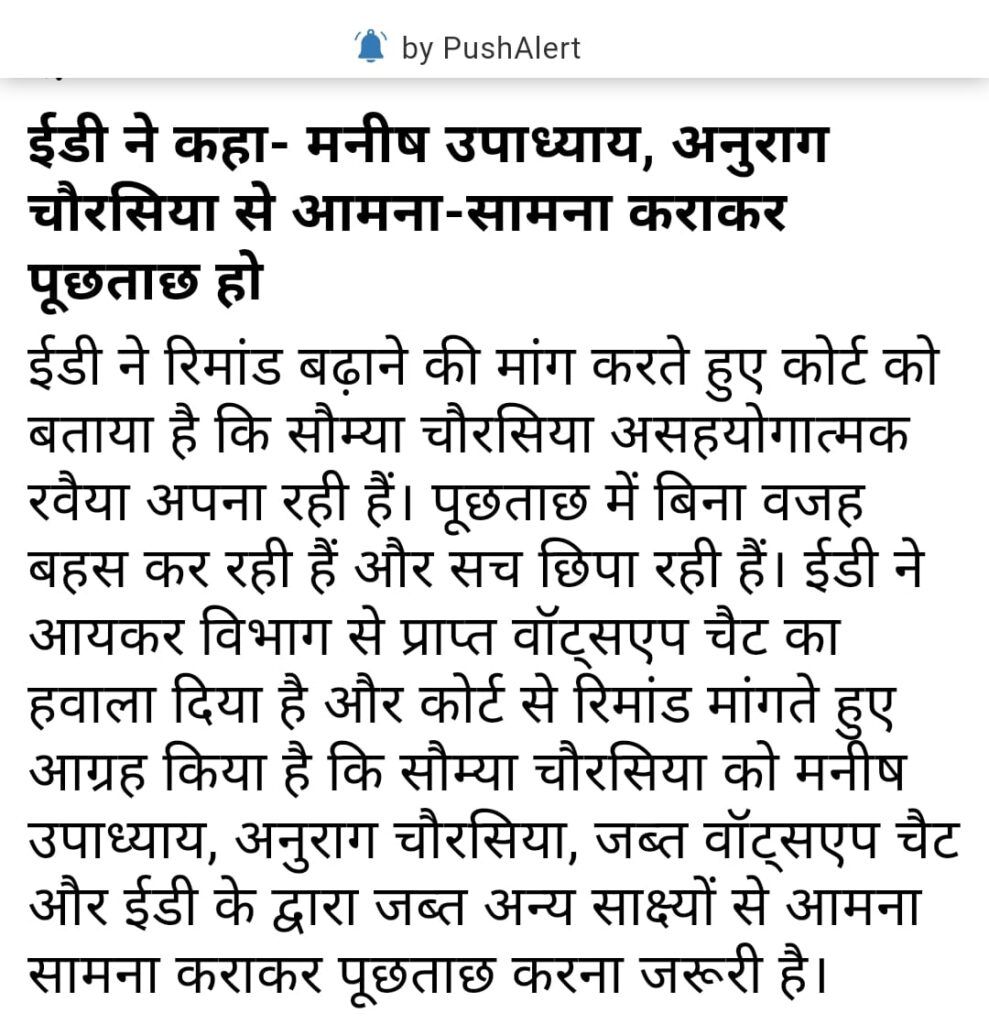 रिमांड पेशी के दिन ईडी ने विशेष न्यायालय को बताया कि सरकार की सभी गुप्त सूचना सूर्यकांत से whatsapp चैट के जरिए शेयर करती थी सौम्या चौरसिया पुछताछ में कर रही है बहस