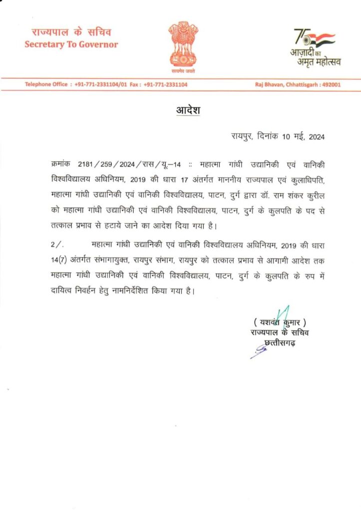 रायपुर : छत्तीसगढ़ के राज्यपाल ने प्रदेश के महात्मा गांधी उद्यानिकी एवं वानिकी विश्वविद्यालय के कुलपति को तत्काल प्रभाव से हटा दिया है । इस संबंध में आज ही राजभवन से आदेश जारी किया गया है। राज्यपाल ने उद्यानिकी एवं वानिकी विश्वविद्यालय अधिनियम, 2019 की धारा 17 अंतर्गत डॉ. राम शंकर कुरील को महात्मा गांधी उद्यानिकी एवं वानिकी विश्वविद्यालय, पाटन, दुर्ग के कुलपति के पद से तत्काल प्रभाव से हटाये जाने का आदेश दिया गया है।